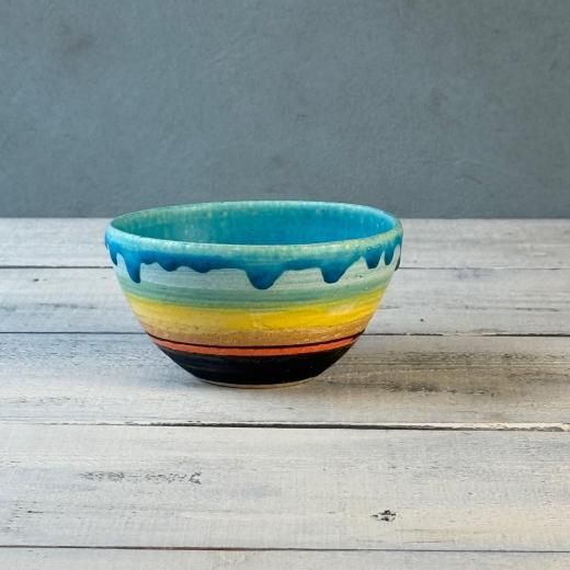 大らかな色と造形が魅力の金城有美子さんの器。沖縄の海に沈むサンセットを思わせる色のグラデーションが素敵です。カフェオレやスープ、デザートやご飯にとオールマイティに使えるボウルです。個体差あり。