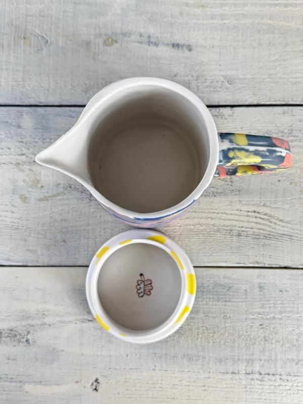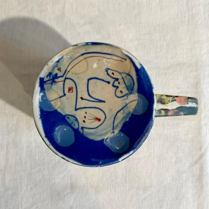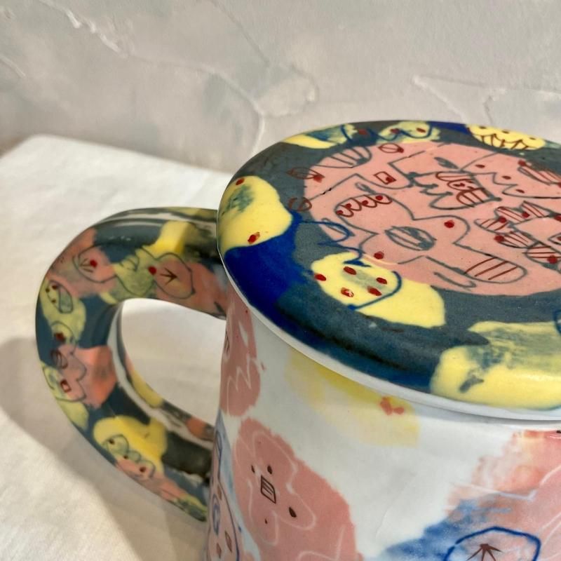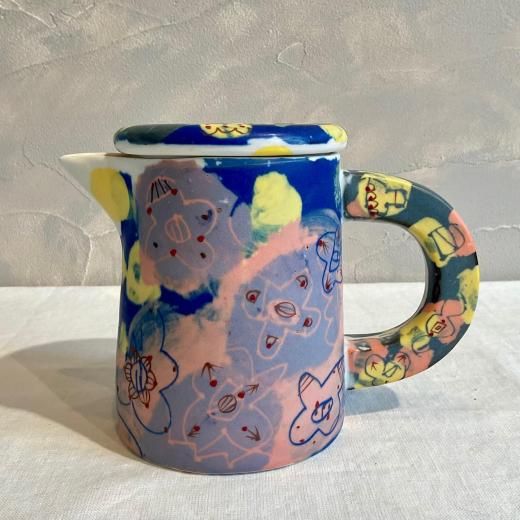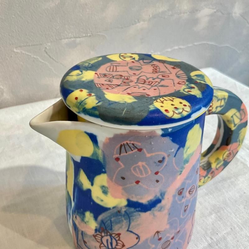 空菴初登場の浜坂尚子さんの今回の個展出品作品。磁器です。落書きのような美しい色目のポット。茶こしがないので蓋を取ればピッチャーとして使えます。蓋は高台皿としてお菓子をのせても素敵です。金彩金彩、銀彩のある器は電子レンジの使用を避けてください。