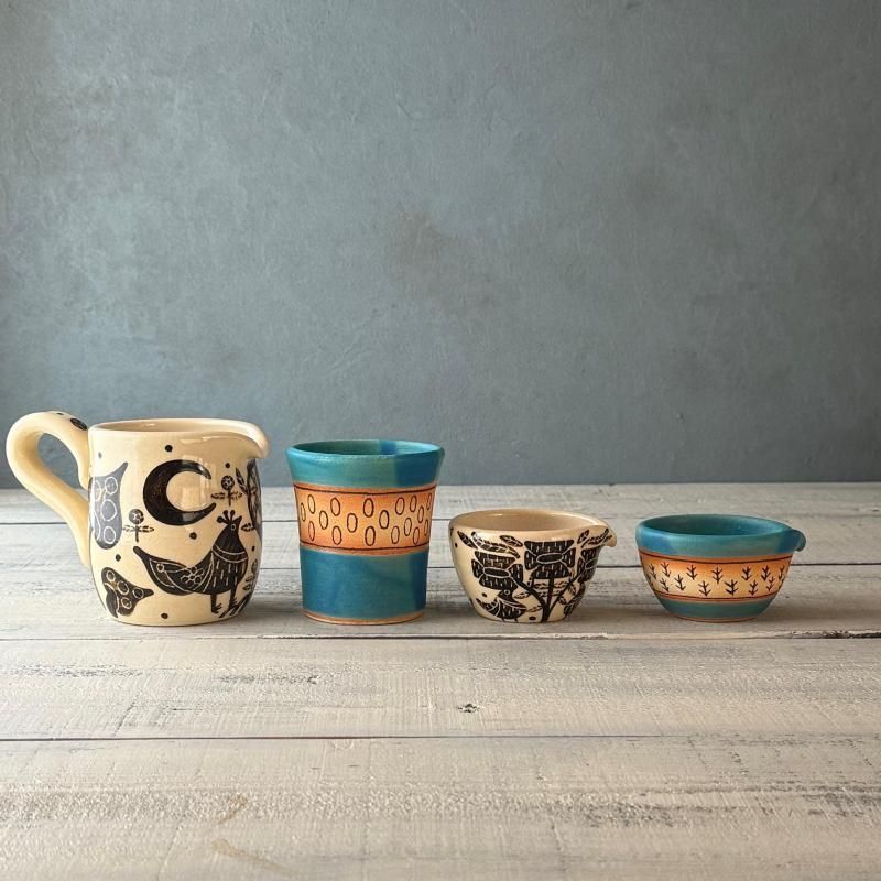 沖縄読谷村で作陶されている双子堂さんのイベント出展作です。工房の窓から見える森の風景ががモチーフです。ミルクピッチャーに。