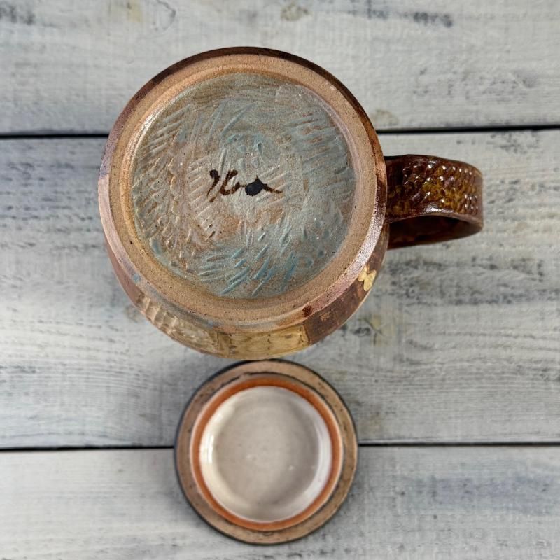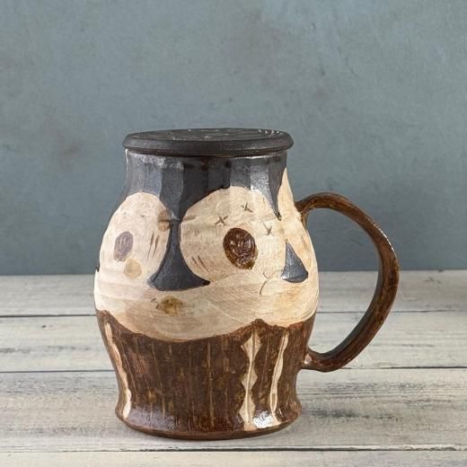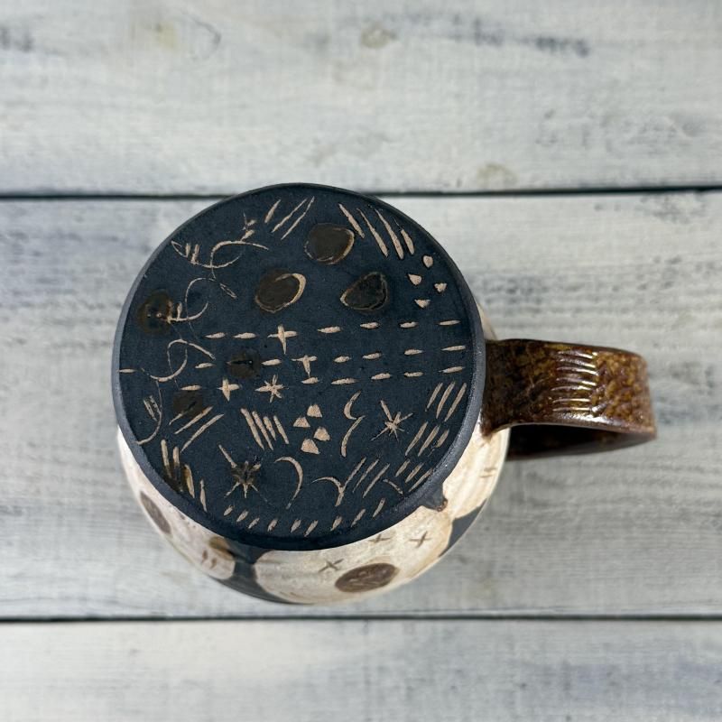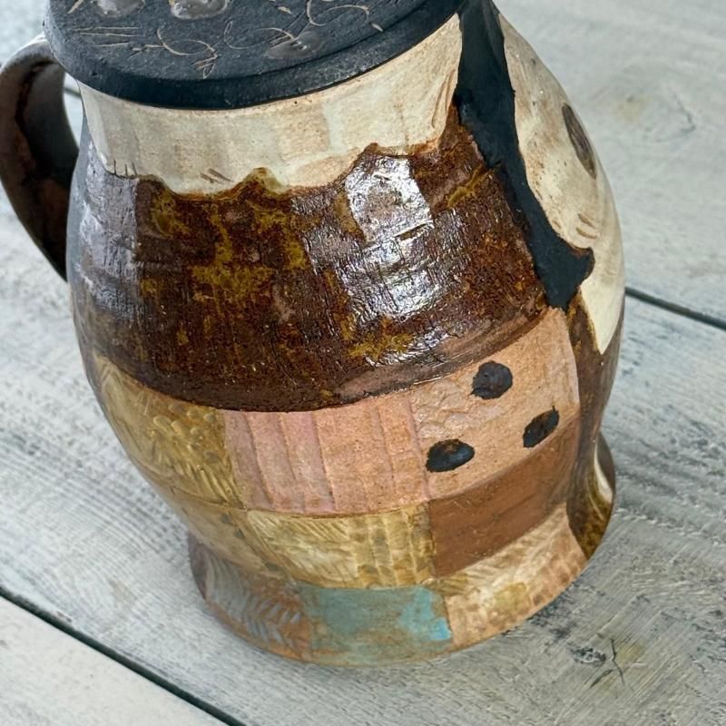 沖縄で作陶されている土から生まれた僕たちさんの初個展の出品作です。土から伝わる昔の記憶に触れるような伸びやかで自由な花器です。表のプリミティブな絵付けの裏はポップな模様と雰囲気が違うのでその日の気分でで見せる面を変えられるのも楽しみです。蓋つき花器は今回の個展で出品点数が多いアイテムでした。それだけ作家さんの思いの深い作品です。