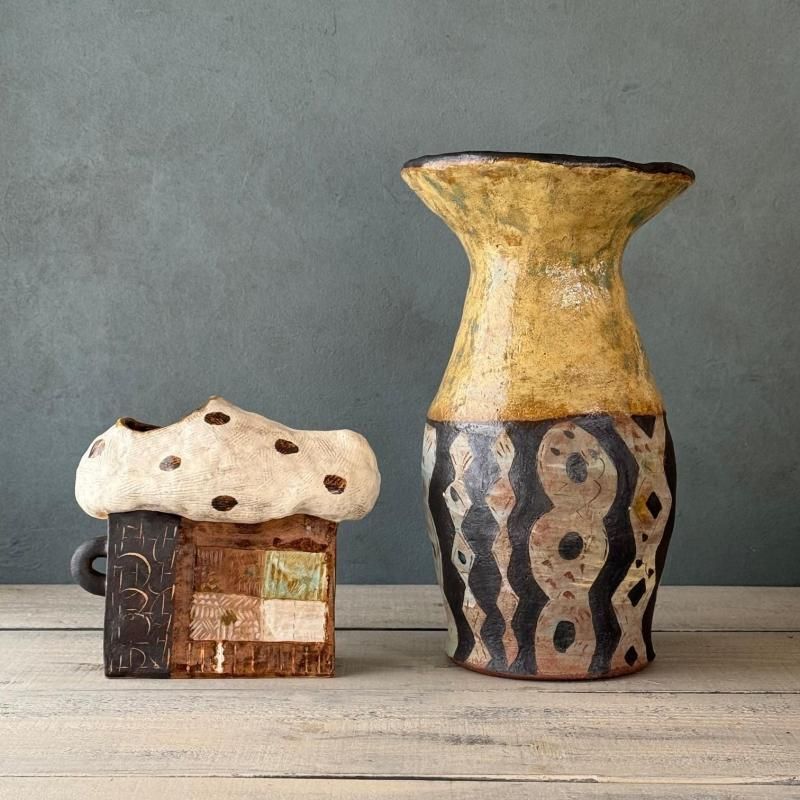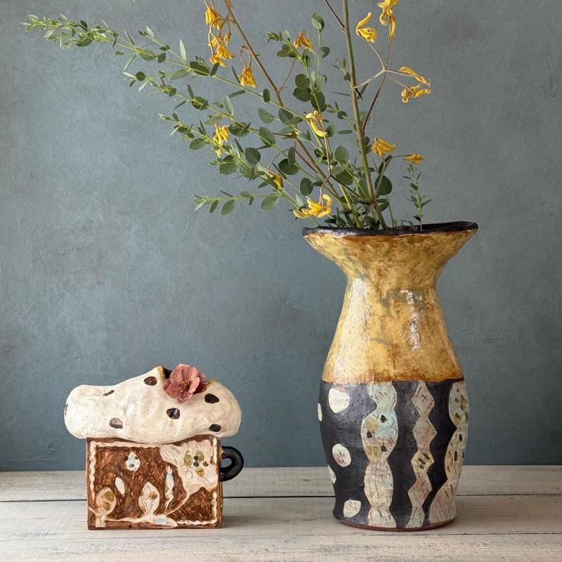 沖縄で作陶されている土から生まれた僕たちさんの初個展の出品作です。土から伝わる昔の記憶に触れるような伸びやかで自由な器です。花を生けなくても存在感のある作品です。