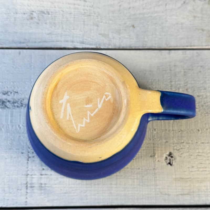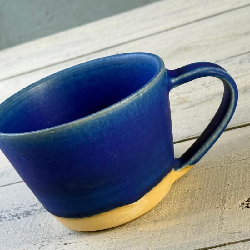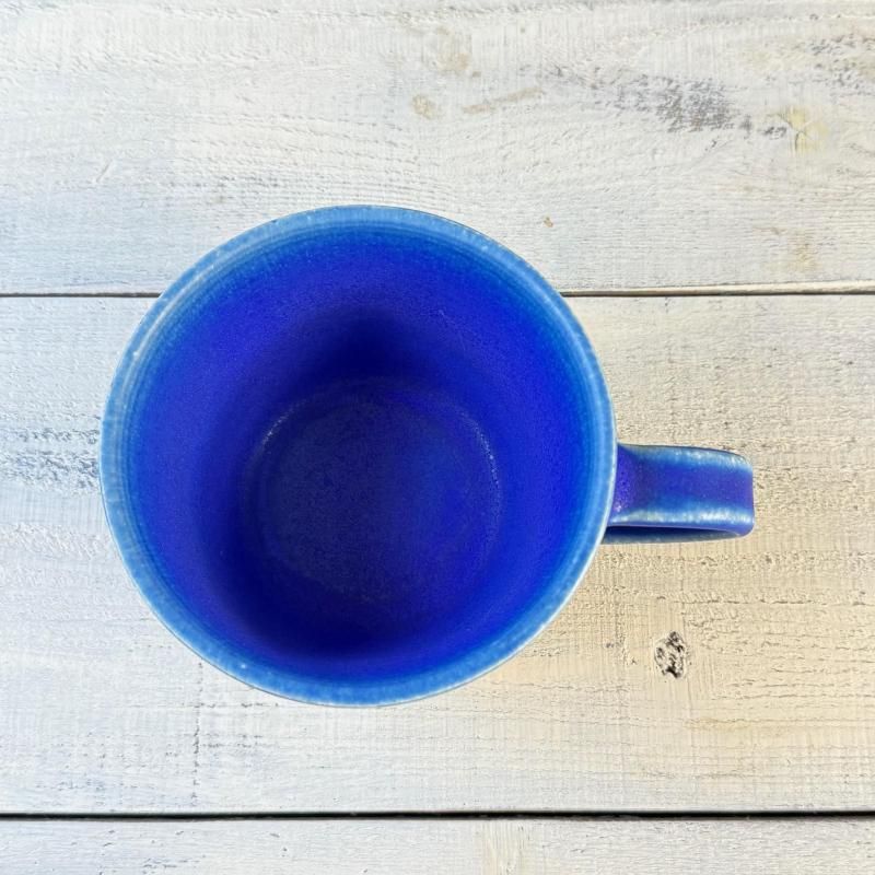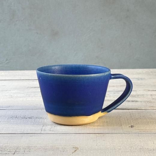 沖縄に工房を構える金城有美子さんの器。キッパリとした深い沖縄の海の色。印象的な持ち手も持ちやすい形。タップリサイズなのでスープにも使えます。