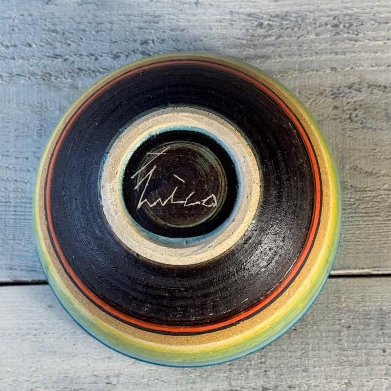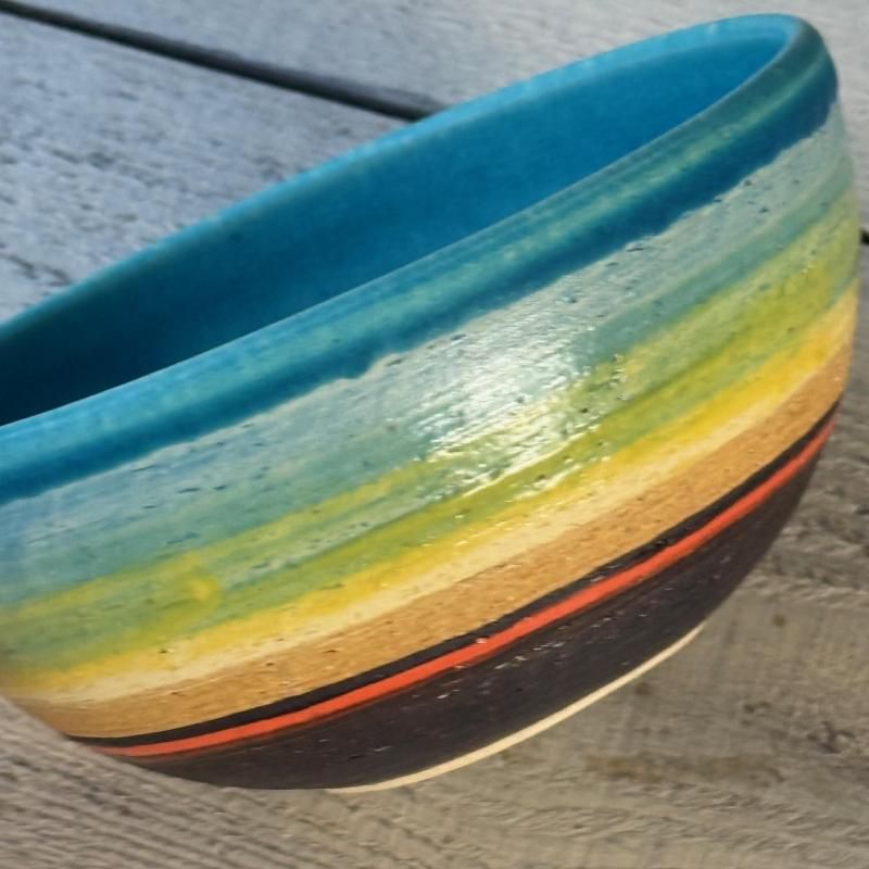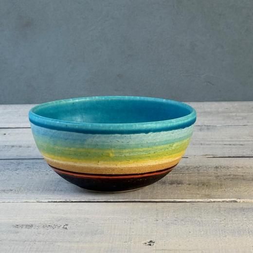 大らかな色と造形が魅力の金城有美子さんの器。沖縄の海に沈むサンセットを思わせる色のグラデーションが素敵です。カフェオレやスープ、デザートやご飯にとオールマイティに使えるボウルです。個体差あり